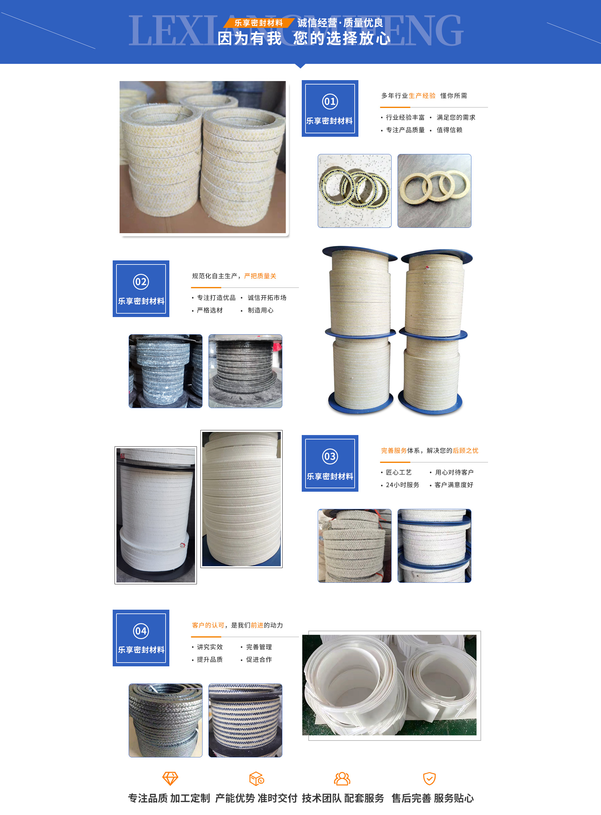 大城縣樂(lè)享密封材料有限公司主營(yíng):芳綸盤(pán)根,四氟盤(pán)根,碳素盤(pán)根,石棉盤(pán)根,芳綸墊片,石棉浸液盤(pán)根,芳綸盤(pán)根墊片,無(wú)油白四氟盤(pán)根,含油白四氟盤(pán)根,含油黑四氟盤(pán)根,石棉含油盤(pán)根,芳綸碳素盤(pán)根,石棉橡膠盤(pán)根,芳綸碳素混編盤(pán)根、聚四氟乙烯板(四氟板)等,是生產(chǎn)銷(xiāo)售密封件的廠(chǎng)家,廣泛應(yīng)用于石油、化工、造紙、造船、發(fā)電、冶金等工業(yè)設(shè)備的管道、閥門(mén)、法蘭、換熱器等。